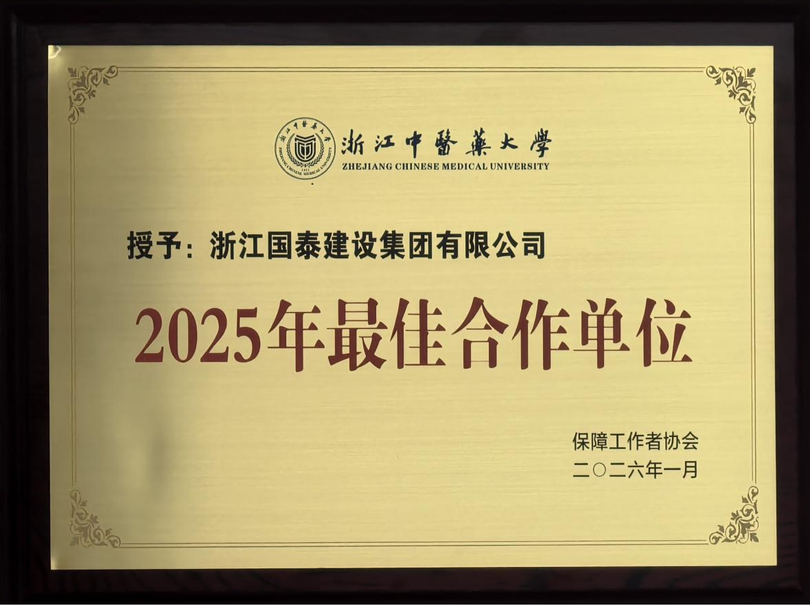 浙江中医药大学新医科(中医)融创项目,紧密围绕安全、质量、进度三要素,主动拉高标杆,以争创省建筑施工安全生产标准化工地和建设工程钱江杯为目标,以评促建,实行标化常态化管理。项目克服连续近3个月高温施工期,实行错峰作业,保障项目进度计划,实现12月底主体结顶,圆满完成建设单位既定目标。浙江中医药大学授予公司“2025年度最佳合作单位”。
